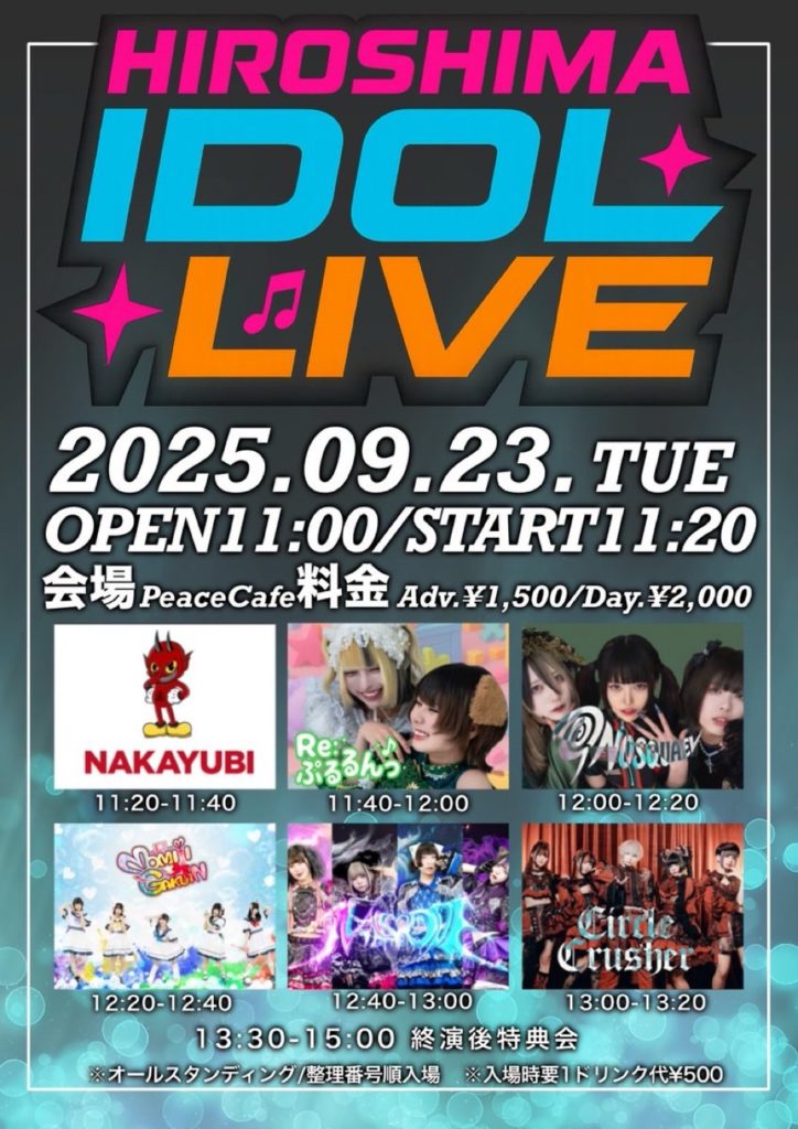 2025.09.16 LIVE情報 info@you-project.jp 【9/23】『広島アイドルライブ』 Twitter Facebook はてブ LINE Pocket 9/23(火祝)『広島アイドルライブ』 会場:ピースカフェ時間:OP11:00/ST11:20料金:前売1500円/当日2000円+1D 予約開始 9/16 20:00tiget.net/events/429805 シェア! Twitter Facebook はてブ LINE Pocket feedly