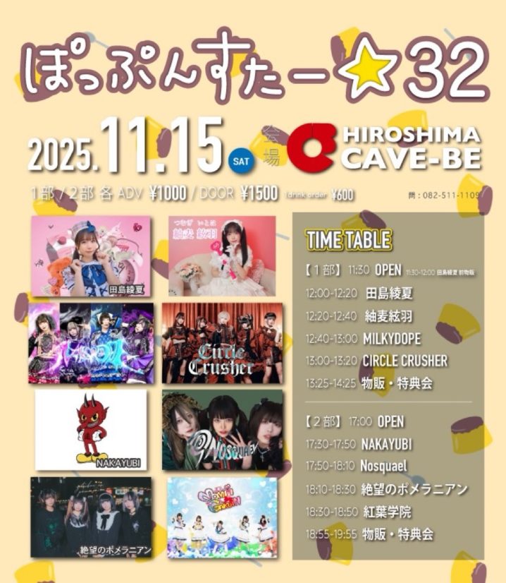 2025.11.14 LIVE情報 info@you-project.jp 【11/15】『ぽっぷんすたー★32』 Twitter Facebook はてブ LINE Pocket 11/15(土)『ぽっぷんすたー★32』 会場:CAVE-BE時間:2部OP17:00/ST17:30※紅葉学院は2部のみ出演料金:前売1000円/当日1500円+1D 予約(2部)tiget.net/events/441491 シェア! Twitter Facebook はてブ LINE Pocket feedly