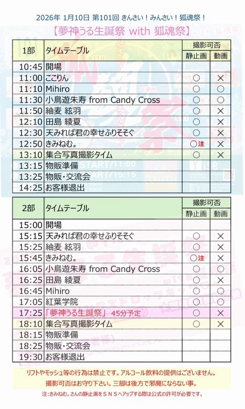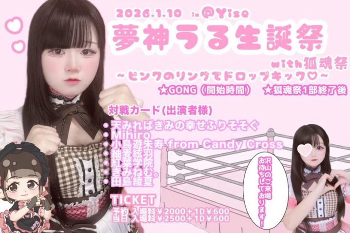 2026.01.07 LIVE情報 info@you-project.jp 【1/10】『夢神うる生誕祭with狐魂祭』 Twitter Facebook はてブ LINE Pocket 1/10(土)第101回 きんさい!みんさい!狐魂祭!『夢神うる生誕祭with狐魂祭』 会場:Yise時間:OP15:00/ST15:15※紅葉学院は2部のみ出演料金:前売2000円/当日2500円+1D 予約▽tiget.net/events/454690 シェア! Twitter Facebook はてブ LINE Pocket feedly