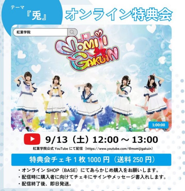 テーマ「兎」9/13(土)12:00-13:00 配信:公式YouTubeyoutube.com/@momijigakuin 特典会チェキ:1000円(各メンバー20枚限定)受付期間 9/2 19:30~9/12 23:…