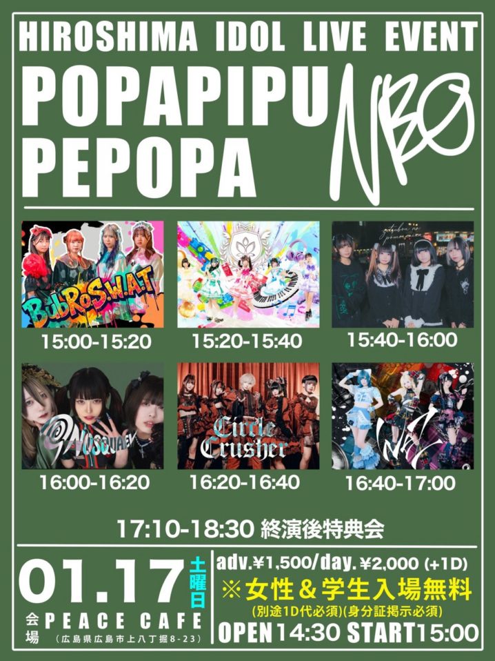 1/17(土)『POPAPIPUPEPOPA NEO』 会場:ピースカフェ時間:OP14:30/ST15:00料金:前売1500円/当日2000円+1D※女性・学生入場無料 予約▽tiget.net/events/458…