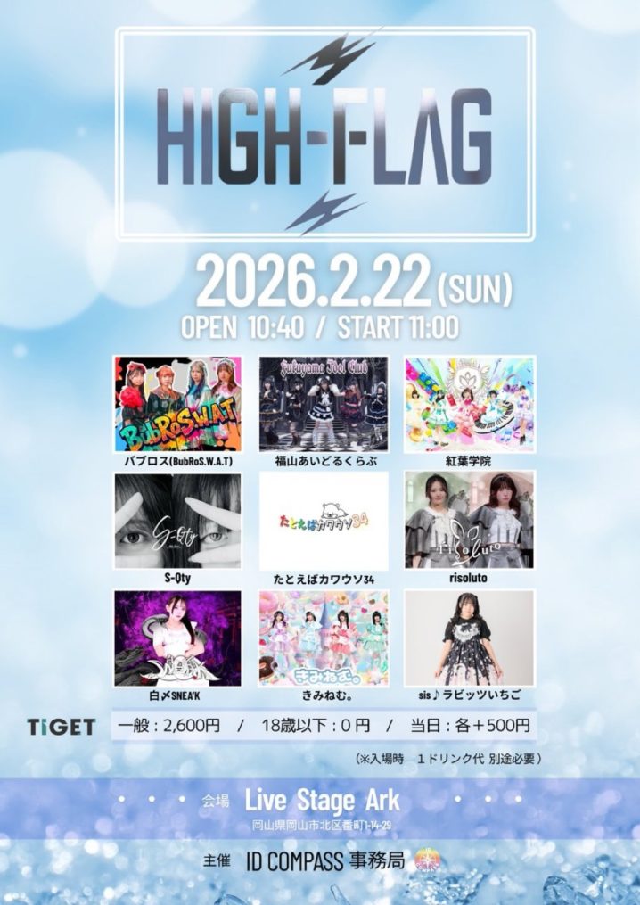 【LIVE情報】岡山遠征 2/22(日)『HIGH-FLAG』 会場:Live Stage Ark時間:OP10:40/ST11:00料金:前売2600円/当日3100円+1D※18歳以下入場無料 予約開始 1/19 2…